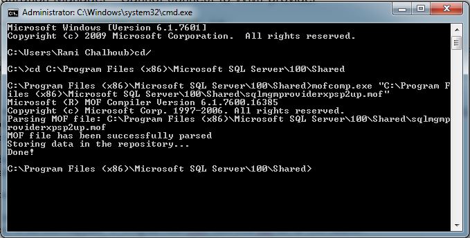 - Use the mofcomp.exe to register the .mof file again by running the following command: mofcomp.exe “C:\Program Files (x86)\Microsoft SQL Server\100\Shared\sqlmgmproviderxpsp2up.mof”