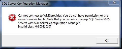 I was trying to access my SQL Server 2008 R2 Network Configuration to enable Tcp/Ip connections to my server through the SQL Server Configuration Manager from the Configuration Tools. But suddenly an error message appeared indicating that I can’t access my configuration manager through the WMI provider. The error message that popped up is shown down below: